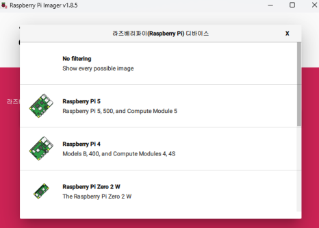 본인이 가진 라즈베리파이 하드웨어의 버전을 찾아서 선택한다. 나는 라즈베리파이 4B라서 두 번째 를 선택하면 된다. 본인의 usb와 sd 카드를 찾아서 꽂아준다. 다음 사진과 같은 형태면 된다.
