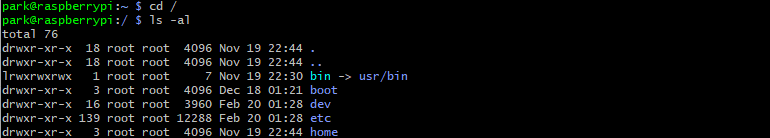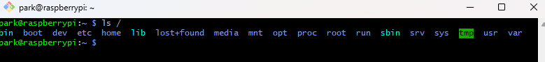 ls는 list의 약자로, 파일 목록을 화면에 출력한다. 리눅스는 디렉토리도 파일로 취급하므로, 디렉토리도 함께 출력이 되며 특수 파일도 조회할 수 있다.