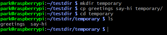3. `cp [옵션] <원본 파일의 경로> <복사한 파일을 저장할 경로>` 방식으로 greetings를 say-hi라는 이름으로 복사한다.
