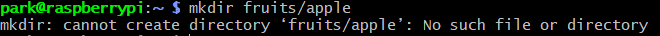 cf) 추가적으로, -p 옵션을 주면 이미 있는 디렉토리인 경우에도 오류 메세지를 출력하지 않고 정상적으로 종료된다.명령은 정상적으로 종료되지만 아무 작업도 수행하지 않습니다. 즉, 오류가 발생하지 않고 조용히 넘어갑니다. -p 옵션이 있으면 디렉토리가 이미 존재할 때 오류를 발생시키지 않는 특성이 있습니다. 이것은 -p 옵션의 "관대한(permissive)" 특성 때문입니다.