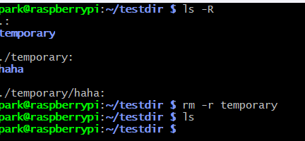 - 상위 디렉토리를 삭제해서 하위의 디렉토리와 파일들을 모두 삭제해본다.