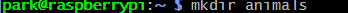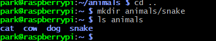 3. 상위 디렉토리로 이동하고, 경로를 주어서 animals 하위에 snake 디렉토리를 생성한다.