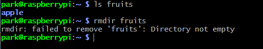 mkdir와 비슷한 형식이며, 입력받은 디렉토리를 삭제한다. 여러 개를 입력받을 수도 있다. 다만, rmdir은 비어있는 디렉토리만 삭제할 수 있다. 삭제 대상에 일반 파일이나 다른 디렉토리가 있으면 실패한다.