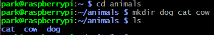 2. animals 디렉토리로 이동하고 dog, cat, cow 디렉토리를 한번에 생성한다.