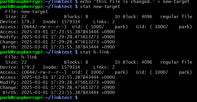 new-target의 파일 내용을 변경해보자.h-link와 new-target 모두 modify 값이 변경되었음을 확인할 수 있다.
