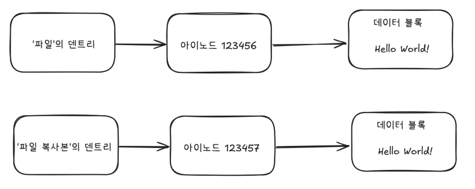 그래서 덴트리, 아이노드, 데이터 블록이 새로 생성되어 새로운 파일과 기존 파일에 대한 관리가 별개로 이루어진다.