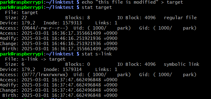 - s-link 파일을 변경해보자.target의 modify 값만 바뀐 것을 알 수 있다.