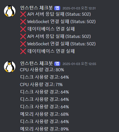 스크립트를 작성해서 CPU, 메모리, 디스크 사용량이 90퍼센트를 넘어가는 등 시나리오를 부하 테스트 해보며 디스코드에 알림이 오는지 테스트 해봤습니다.