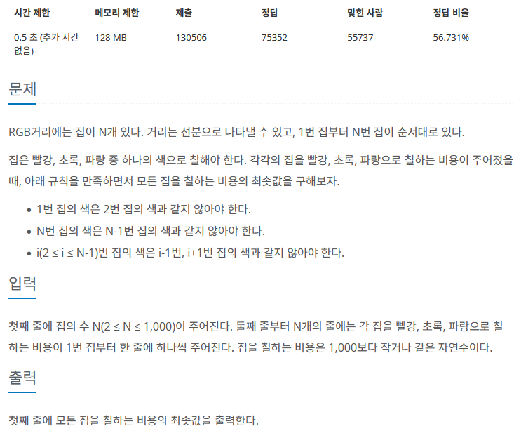 DP를 사용해야 했다. 여러 상태를 고를 수 있어서 R과 G와 B를 고른 뒤 각각의 상태를 따로 관리하는 것이 포인트였다.