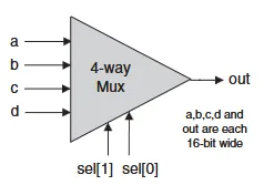칩 이름: MUX4WAY16 입력: a[16], b[16], c[16], d[16], sel[2] 출력: out[16] 기능: if(sel == 00, 01, 10 or 11) then out = a, b, c, or d 설명: 할당은 16비트 연산이다. 예를 들어 'out = a'는 'for i = 0..15 out[i] = a[i]'라는 의미이다.