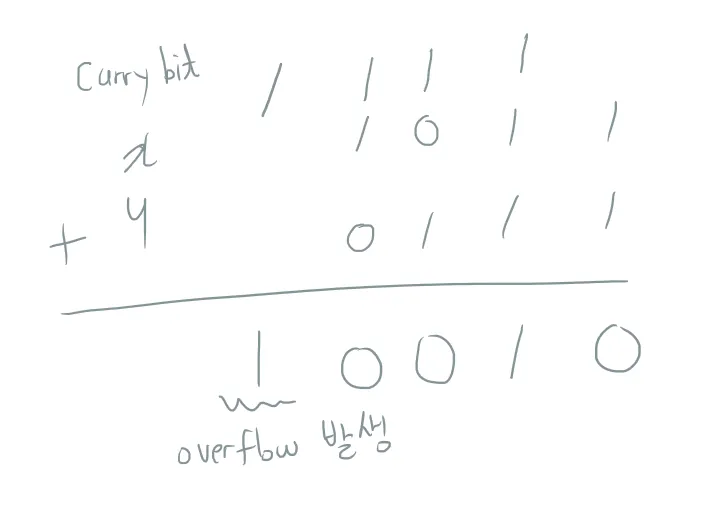 실제 컴퓨터에서는 오버플로우 플래그를 두고 오버플로우가 발생하는지 항상 확인하며 에러 처리를 하는 등 뭔가 처리가 되어 있지만 그건 결정에 따른 문제이다.