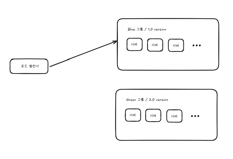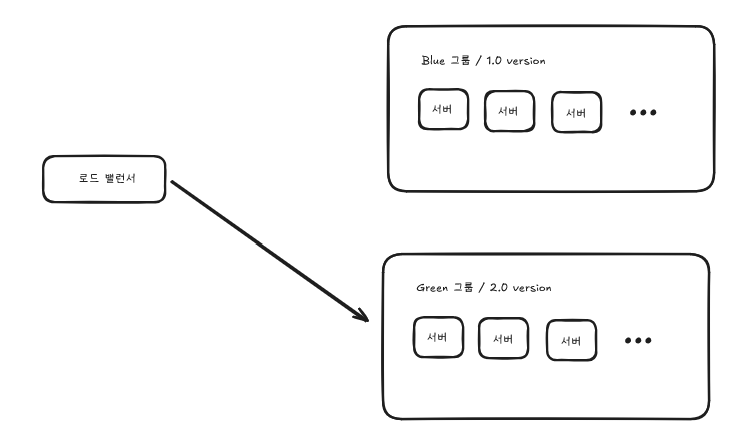 운영중인 구버전의 Blue 그룹과 신버전인 Green 그룹을 동시에 띄워놓고, 로드밸런서를 활용해서 트래픽을 한 번에 Green 그룹으로 전환하는 방식입니다.
